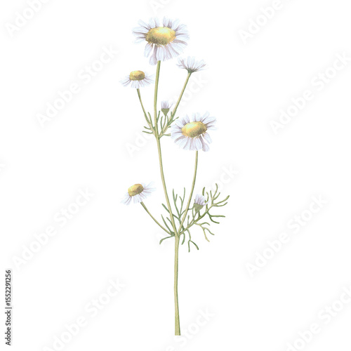 Watercolor illustration of chamomile flowers. Hand-drawn isolated clip-art on white background. Delicate realistic images of herbs for packaging, textiles, printing, holiday cards, wedding, menu