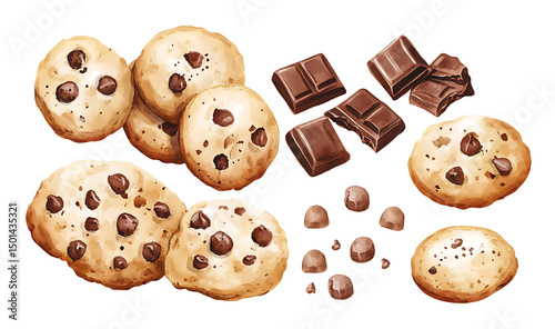 Watercolor illustration of chocolate chip cookies and chocolate pieces on transparent background