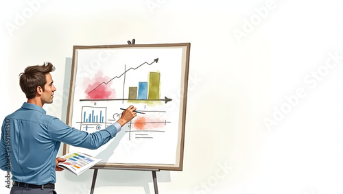 Watercolor Illustration of Corporate Finance: Finance Director Strategizing Capital Flow and Balance Sheets on Soft Panels with Empty Space