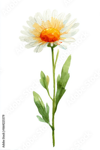 Watercolor illustration of daisy flower with vibrant petals and green leaves, showcasing beauty
