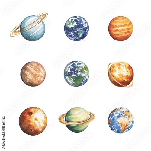 Watercolor illustration of nine planets in our solar system, including Earth, Jupiter, Saturn, Uranus, and Neptune.