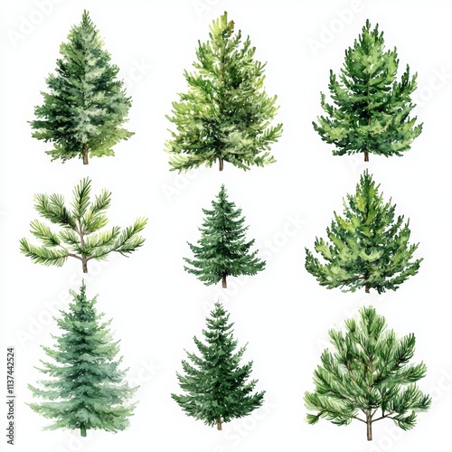 Watercolor Illustration of Norway Spruce from Top View, Isolated on White Background, for Use in Botany, Gardening, and Nature-Themed Designs