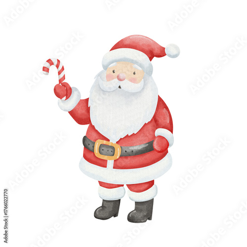 Watercolor illustration of Santa Claus in traditional red suit holding red and white candy cane. Cute festive character in childlike style, isolated on white background.