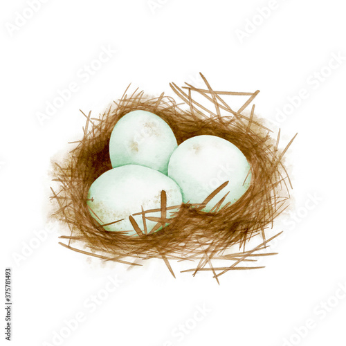 Watercolor Illustration of Three eggs in the nest, isolated on white background.