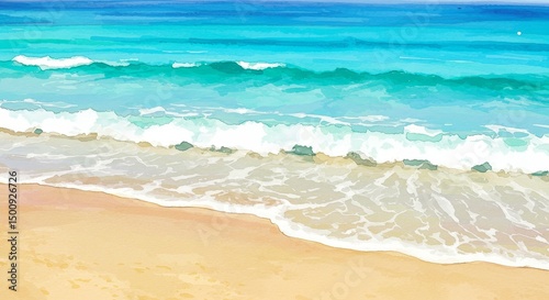 Watercolor Illustration of Turquoise Ocean Waves Crashing on Sandy Beach
