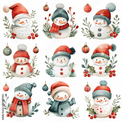 Watercolor illustration of various cute snowmen wearing hats and scarves, adorned with holiday greenery. Perfect for cheerful and festive winter designs.