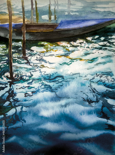 Watercolor illustration. The boat on the water. The Grand Canal in Venice. Waves, splashes and reflections on the water