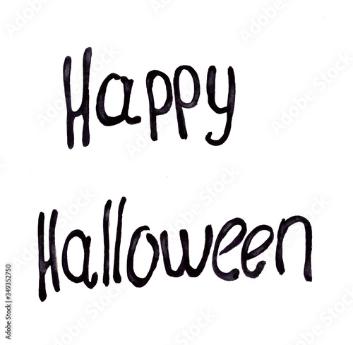 Watercolor illustration. Words - Happy Halloween. Caligraphic black is a white inscription. Lettering