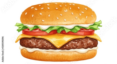 Watercolor Juicy Cheeseburger Delight - A mouthwatering cheeseburger with sesame seed bun, lettuce, tomato, cheese, and a juicy patty. Perfect for food blogs, menus, or advertising