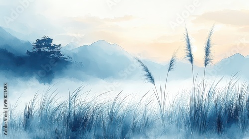 Watercolor Landscape Painting Blue Mountains Fog and Grass