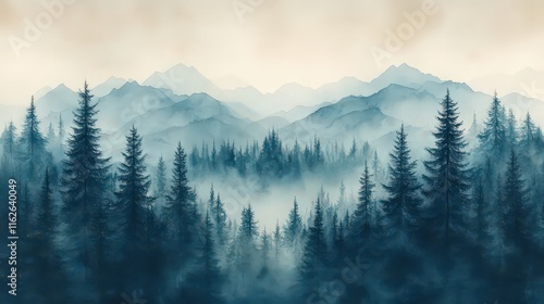 Watercolor landscape with mountains and forest. Beautiful landscape.