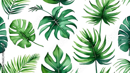 Watercolor Leaf Pattern with Tropical Greenery for Backgrounds and Design