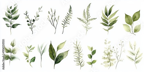 Watercolor Leaves and Ferns Arrangement Green Botanical Illustration for Wedding Stationery and Decor