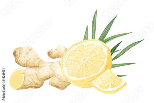 Watercolor lemons with raw ginger roots and leaves watercolor illustration in pastel yellow and green colors isolated on white. Citrus fruits for traditional medicine recipes and sour desserts