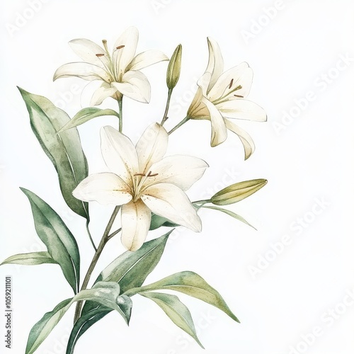 Watercolor lily branch, gentle, elegant on white background