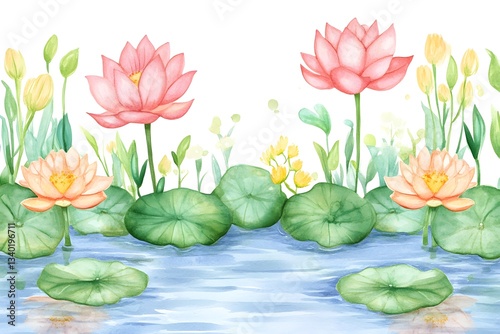 Watercolor Lotus Flowers Pond Plants Lily Pads Floral Border