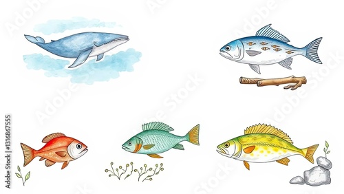 Watercolor Marine Life Whale Fish Aquatic Plants