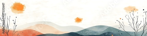 Watercolor Mountain Landscape: A serene watercolor painting depicts rolling mountains, vibrant skies, and stylized flora, creating a sense of tranquility and artistic beauty.
