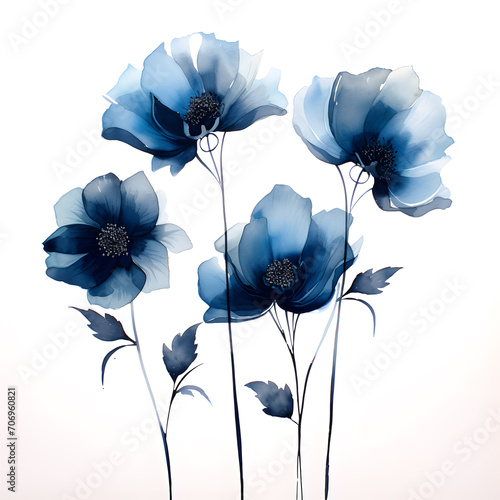 Watercolor navy blue flowers set, vintage flowers collection