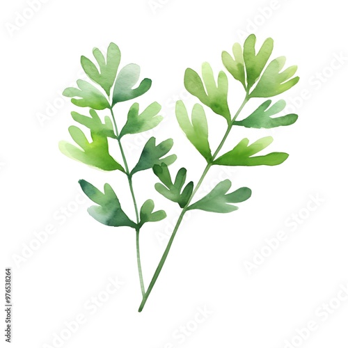 Watercolor of a Rue Sprig with Aromatic Green Leaves on a White Background