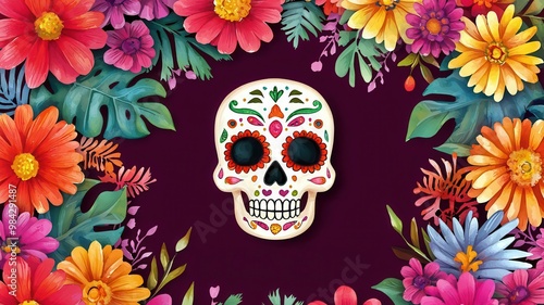 Watercolor of a vibrant sugar skull surrounded by cempasuchil flowers, with traditional Day of the Dead decorations framing the scene