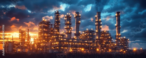 Watercolor of an industrial plant at night, glowing lights reflecting off steel structures, rich dark tones blending into the night sky