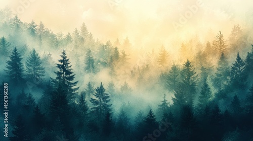 Watercolor of landscape forest misty mountains horizon and fog and hills,pine tree fir tree,Autumn forest background,drawn by hand,Autumn illustration design elements for landscape,wallpaper.