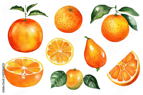 Watercolor of Oranges and slices clipart isolated on clear background, popular fruits citrus, painting design concepts, with Generative Ai.