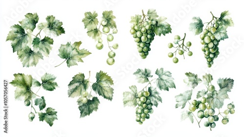 Watercolor of Shine muscat with leaves, painting,vector illustration drawing isolated,Hand drawn,Bright green muscat grapes on white background,copy space.