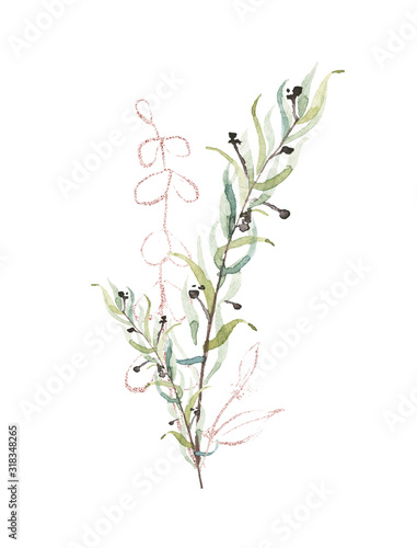 Watercolor painted floral bouquet isolated on white background. Arrangement with branches, leaves, pink gold dust graphic elements.