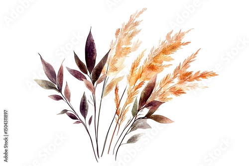 Watercolor Painted Pampas Grass And Dark Leaves In A Composition On White Background