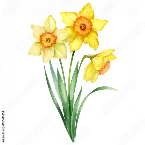 Watercolor painting depicting yellow daffodils blooming against pristine white background