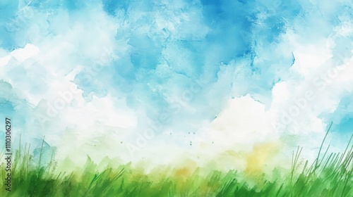 Watercolor painting grassy field blue sky background filled blurred horizon abstract