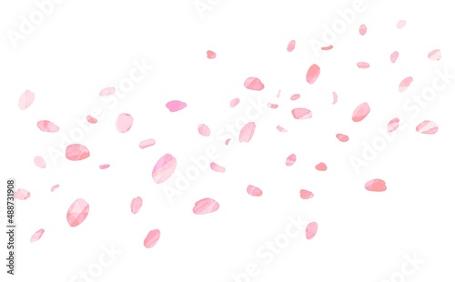 水彩画。水彩画風アナログ加工の舞う桜の花びらイラスト。Watercolor painting. Illustration of dancing cherry blossom petals in watercolor style analog processing.