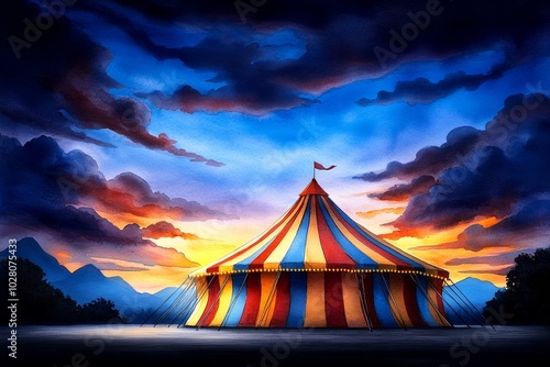 Watercolor painting of a circus tent at sunset, with soft, flowing colors capturing the warm glow of the evening sky and the vibrant stripes of the tent as the day fades into night