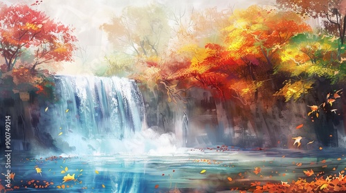 Watercolor painting of a waterfall in an autumn forest. Concept of nature, landscape, fall season, tranquility