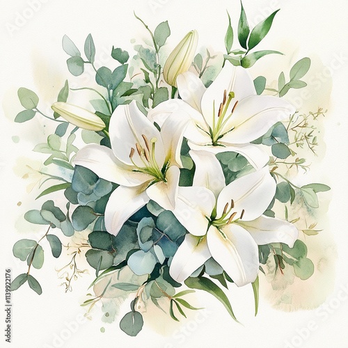 Watercolor painting of a wedding floral centerpiece featuring white lilies and eucalyptus leaves.