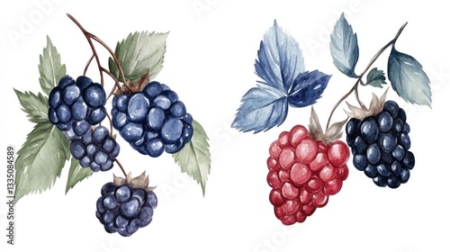 Watercolor Painting of Blackberries and Raspberries