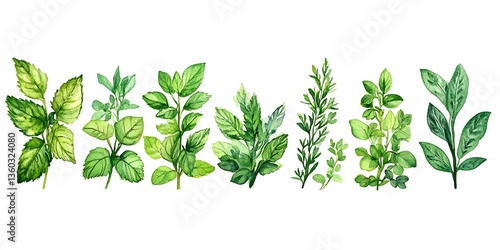 Watercolor Painting of Different Green Leafy Plant Sprigs
