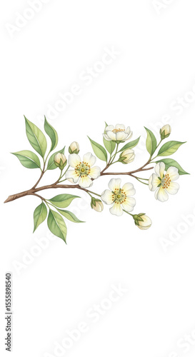 Watercolor painting of flowering branch with white blossoms and green leaves isolated PNG with Transparent Background