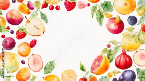 Watercolor Painting of Fresh Fruits and Berries Arranged in a Border