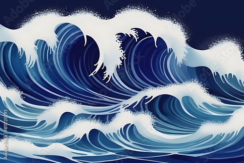 Watercolor painting of large ocean waves crashing onto the shore. The waves are blue and white. with details of bubbles at the top