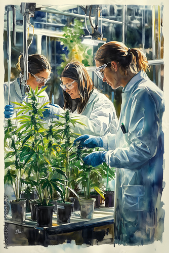 Watercolor painting of male and female researchers examining marijuana plants in a greenhouse.