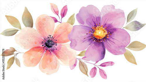 Watercolor painting of pink and purple flowers with leaves..
