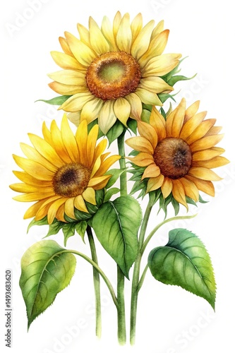 Watercolor Painting of Three Sunflowers with Green Leaves on White Background