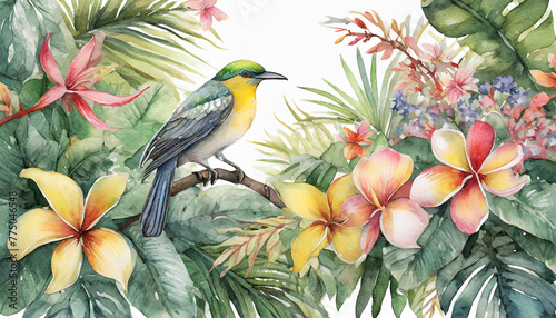 Watercolor painting of tropical leaves and flowers, beautiful bird. Summer season. Botanical art