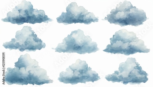 Watercolor painting shows collection of various clouds on transparent backdrop. Elements fluffy, light, isolated, watercolour style. Digital design for weather, sky, nature, artistic concepts. Ideal