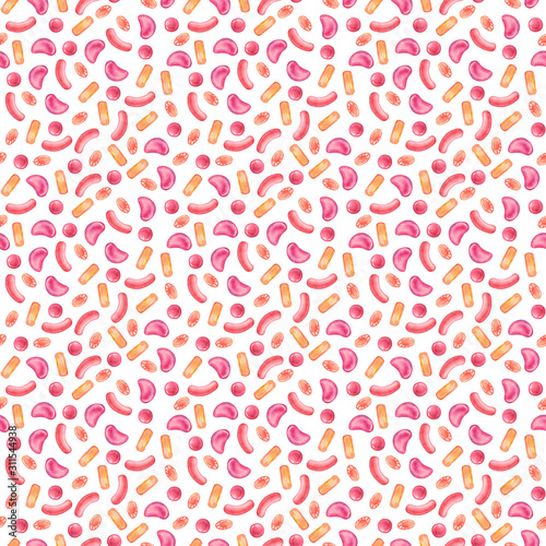Watercolor pattern with orange, pink, red sweets. Sweet candies of different shapes on a white background in cartoon style. Food illustration for packaging, paper, textile