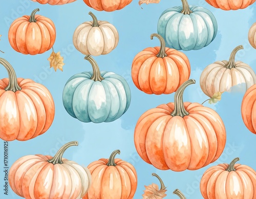 Watercolor pumpkins on a light blue background