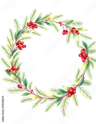 Watercolor round christmas frame with fir branches berry leaves plant herb winter flora isolated on white background. Botanical greenery holiday illustration for wedding invitation card design, Colo